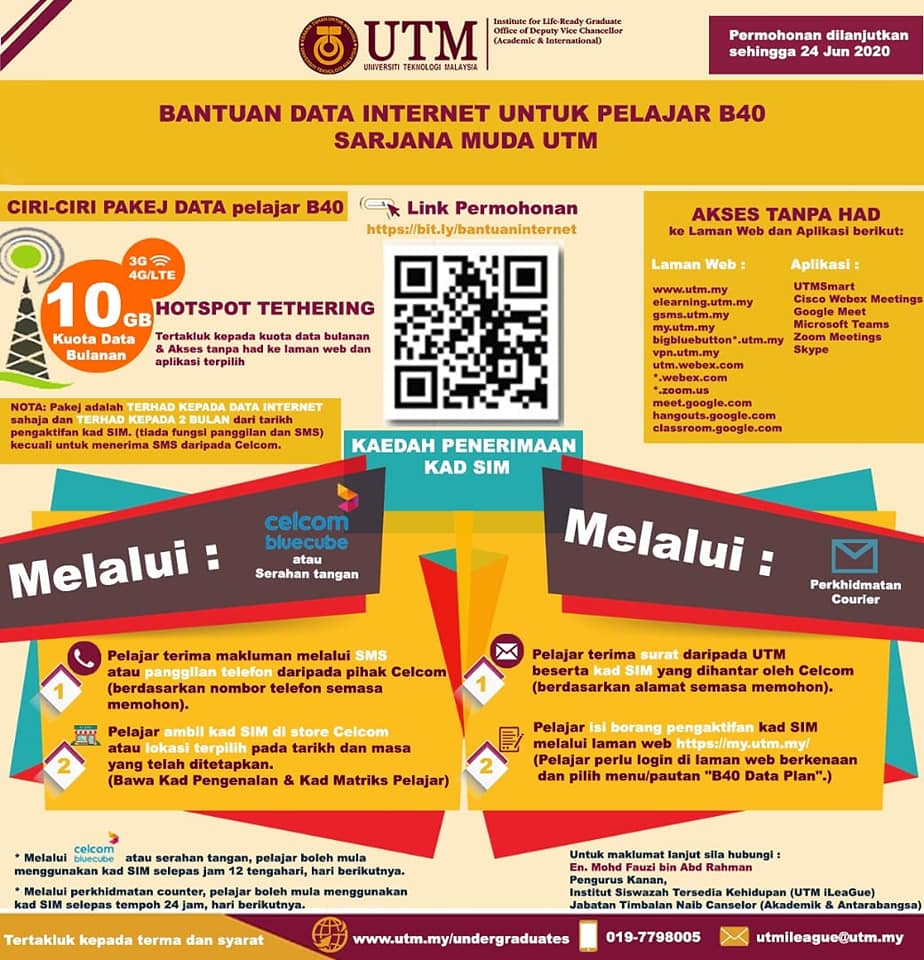 Universiti Teknologi Malaysia mengambil maklum dan amat prihatin akan kekangan kewangan pelajar terutama pelajar di kalangan keluarga berpendapatan RM4000 ke bawah (B40) bagi meneruskan proses pembelajaran secara dalam talian. Oleh yang demikian, Universiti Teknologi Malaysia ingin menyalurkan bantuan pelan internet kepada pelajar B40 secara percuma selama 2 bulan untuk pelaksanaan pembelajaran dan penilaian dalam talian. Bantuan ini akan disalurkan kepada pelajar pelajar yang layak iaitu:
