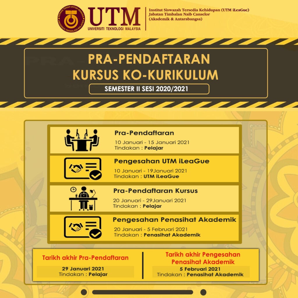 NOTICE OF PRE-REGISTRATION CO-CURRICULUM COURSE AMONG UNDERGRADUATE (UG) STUDENTS FOR SEMESTER 2020/2021 FOR YOUR KINDLY ATTENTION.