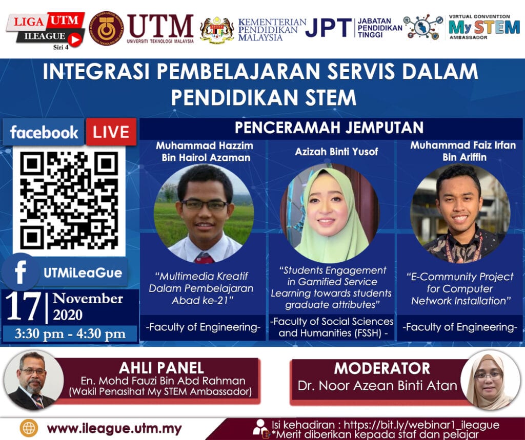 Dimaklumkan bahawa, Institut Siswazah Tersedia Kehidupan (UTM iLeaGue), UTM menganjurkan program seperti di bawah. Sehubungan dengan itu, saudara adalah dijemput melawati Facebook UTM iLeaGue untuk menyertai FB Live Liga UTMiLeaGue ini.