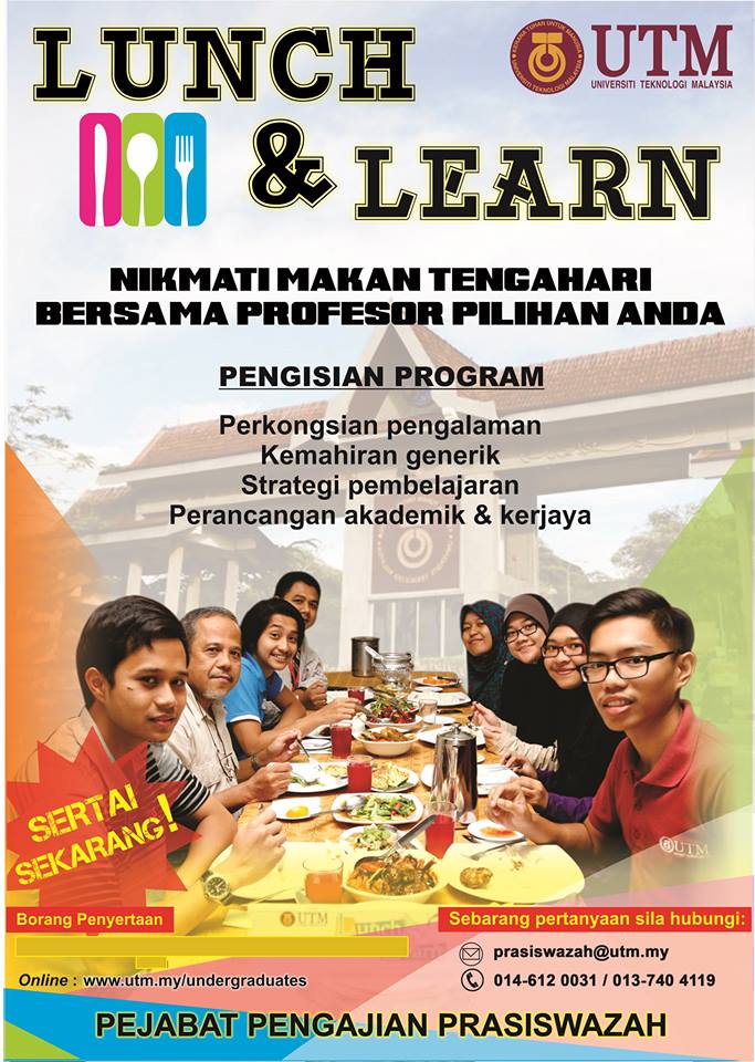 Program Lunch & Learn bersama Profesor UTM merupakan satu program ilmiah secara santai yang dilaksanakan oleh pihak UGS untuk mendekati pelajar secara lebih dekat bagi memenuhi beberapa keperluan seperti berikut: